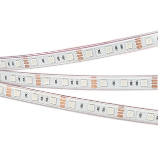 Герметичная мультицветная лента LUX шириной 13 мм с высокой степенью пылевлагозащиты IP66 (в силиконовой трубке) и RGB-светодиодами SMD 5060 (60 шт/м). Мощность 14.4 Вт/м, напряжение питания 12 В. Широкий шаг между светодиодами создает эффект видимых точек светодиодов. Освещение интерьеров и создание декоративной подсветки. Использование во влажных помещениях. Оформление наружной рекламы и витрин. Управляется RGB-контроллером. Минимальный отрезок 50 мм (3 светодиода).