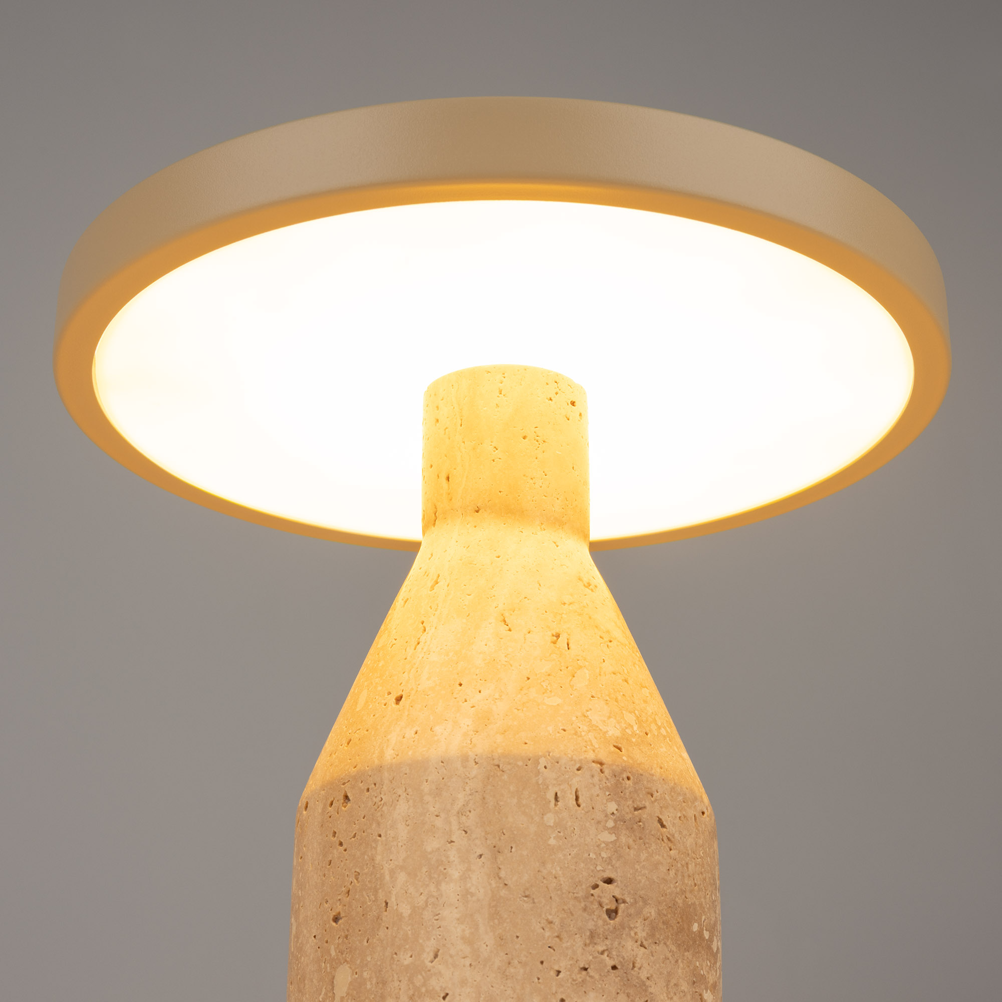 Настольный светильник CROOD. С изменяемой цветовой температурой 2700/3200/4000K, переключается коротким нажатием на сенсорную кнопку на плафоне, диммирование происходит за счет ее удержания. Мощность 7 Вт, св. поток 159 лм, 23 лм/Вт, CRI>94, угол 140°, напряжение питания 230 В. Бежевый плафон из алюминия, основание из травертина, степень защиты IP20. Общая высота 240 мм. Габариты светового модуля DхH: 225 x 22 мм. Габариты основания DхH:: 100 x 220 мм. Пульсация <1%.